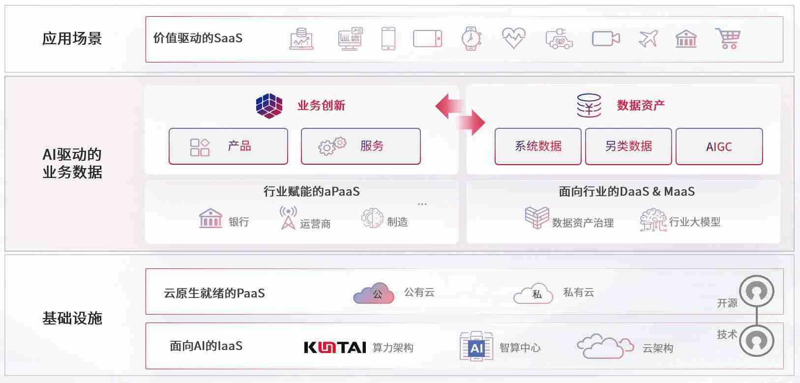 数字时代,,,,围绕企业数字化转型的关键要素,,NO钱包数码开创性的提出数云融合战略和技术体系框架,,,,着力在云原生、、、、数字原生、、AI原生和信创产业上架构产品和服务能力,,,,为处在不同数字化转型阶段的快消零售、、汽车、、金融、、医疗、、、、政企、、、教育、、、运营商等行业客户提供泛在的敏捷IT能力和融合的数据驱动能力,,,构建跨界融合创新的数字业务场景和新业务模式,,,助力企业级客户建立面向未来的核心能力和竞争优势,,,,全面推动社会的数字化、、智能化转型升级。。